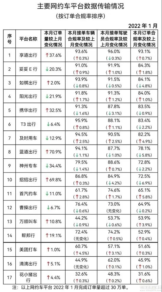 在订单量超过30万单的网约车平台中,订单合规率最高的是享道出行,最低的是花小猪出行。2022年1月订单量超过30万单的网约车平台共17家。按订单合规率(指驾驶员和车辆均获得许可的订单量占比)从高到低的分别是享道出行、妥妥E行、如祺出行、阳光出行、携华出行、T3出行、及时用车、蓝道出行、神州专车、招招出行、首汽约车、曹操出行、万顺叫车、帮邦行、美团打车、滴滴出行、花小猪出行。本月订单合规率增长前3名的依次是首汽约车、及时用车、万顺叫车;增长最后3名的依次是如祺出行(-4.8%)、蓝道出行(-5.8%)、招招出行(-6.9%)。