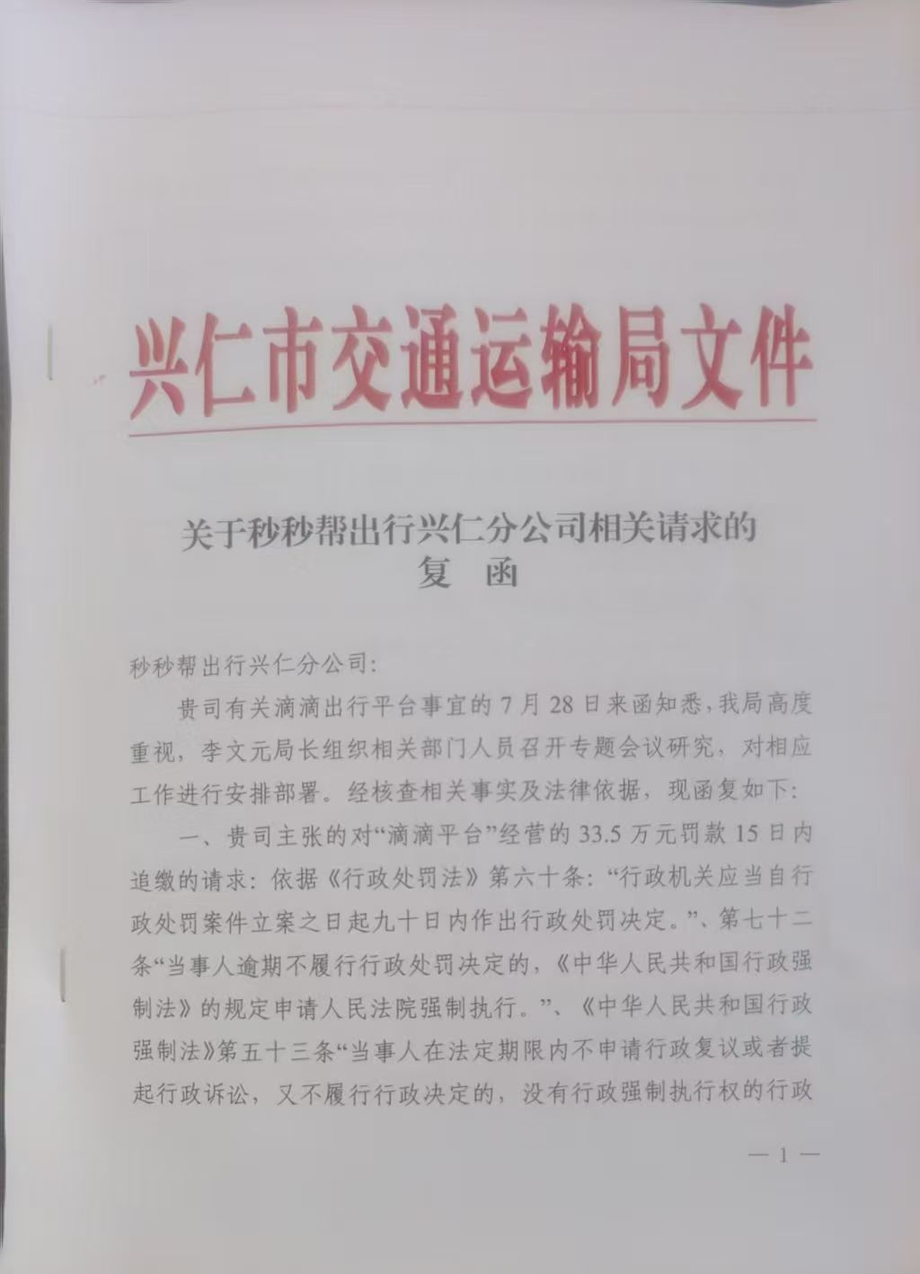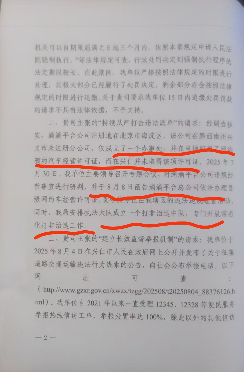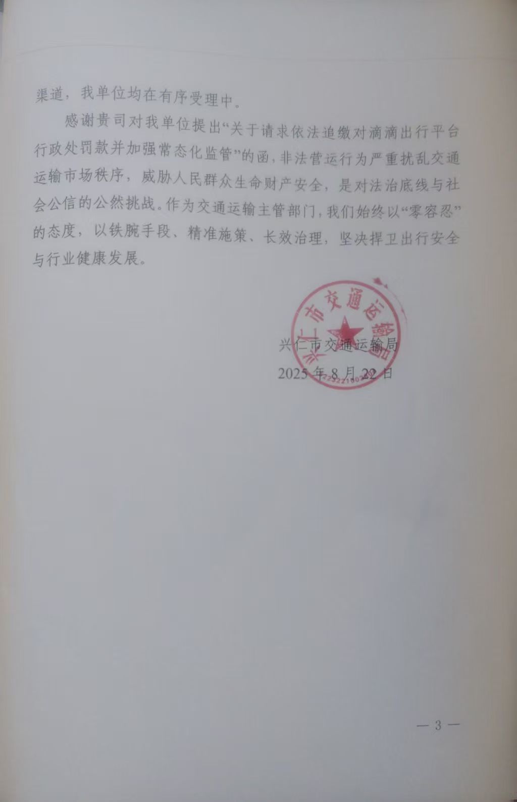 2025年7月30日,我单位主要领导召开专题会议,对滴滴平台公司违规经营事宜进行研判,并于8月8日函告滴滴平台总公司依法办理县级网约车经营许可证,责行工住我辖区的违法建九工官后同时,我局安排执法大队成立一个打非治违中队,专门开展常态化打非治违工作。